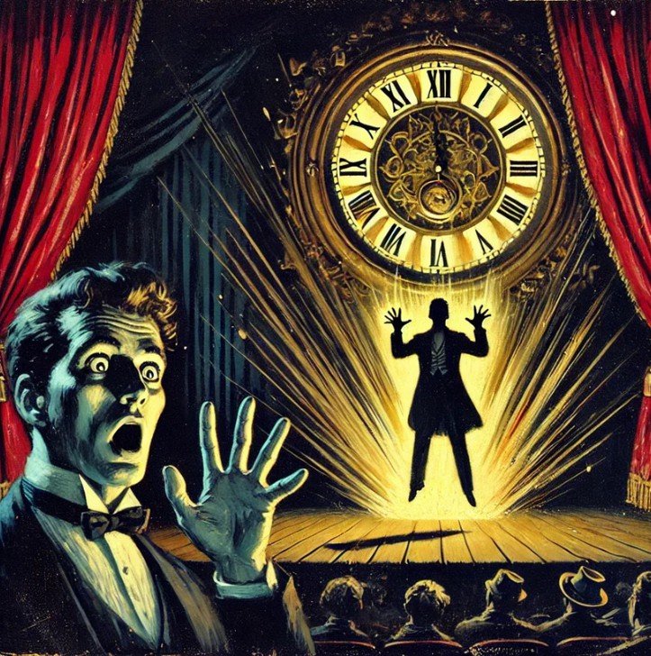 The performer stops time, as proven when a volunteer’s watch stops in their hand while a borrowed ring, also held by them, remains impossibly suspended in mid-air, the performer standing away from the events.