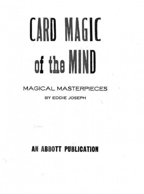 Just because one has acquired extreme dexterity in the manipulation department it does not stand to reason that CARD MAGIC OF THE MIND can be easily presented as a bunch of tricks. The Magician appears in the role of a Mentalist when doing CARD MAGIC OF THE MIND. He is supposed to be working with his MIND and not his HANDS. Any attempt at speed or undue display of manual dexterity will ruin the whole thing. One should remember to keep it that way.