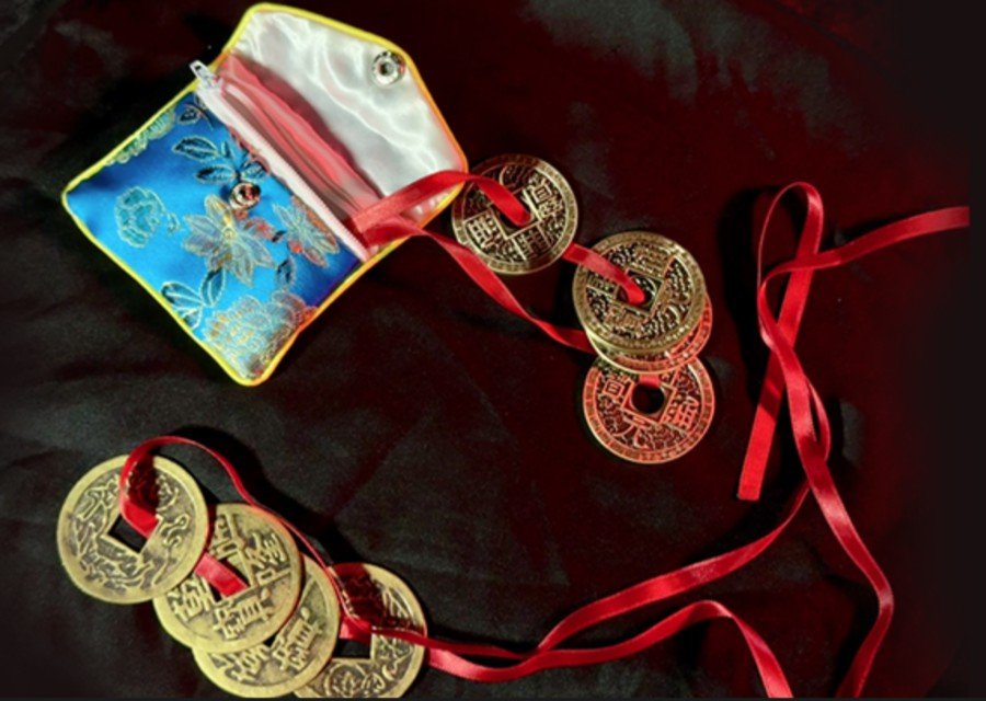 The final coin is visibly on the ribbon before being removed – even while held by the spectator.These are authentic Feng Shui amulet coins, slightly larger than dollar coins, and 100% examinable.
