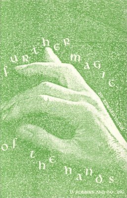 This is the third volume in a series of which Magic of the Hands and More Magic of the Hands were Volumes I and II, respectively. Like its predecessors, Further Magic of the Hands presents sleights and tricks with cards, coins, balls, thimbles, handkerchiefs, and other small articles. It is somewhat more expensive and slightly smaller than either of the earlier volumes, totaling (after deducting blank pages, and the unorthodox and quite unnecessary "half-titles" between chapters) about 100 pages. There are 88 line drawings by the author, and three photographic halftones.