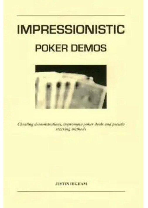 Impressionistic Poker Demos is the follow-up book to Justin Higham's Pseudo Cheating Demos and Effects. The first part of the book further explores Spread-Count Stacking, a way to stack the Aces or a full house/royal flush to a desired number of hands using combinations of spread-counts. The idea is to get away from standard stacking methods, although several pseudo stacking effects are described which make minimal use of techniques such as Riffle Stacking and Overhand Stacking. Also included is a Frank Lane style poker deal in which the spectator deals any small number of poker hands, yet the performer ends up with a royal flush (no palming, switching, etc.). Other items include impromptu blackjack demos, a spectator-shuffled full-house deal by Dylan Holmes, 'Pick-Up Restacking' by Ben Earl (4 methods), and a previously unpublished Bottom Deal for beginners by Edward Marlo. The section on '100% Poker Deals' follows on from The 75% Production in showing how to take a borrowed, shuffled deck and almost immediately deal yourself (or the spectator) four of a kind or a full house. At the end of the book are comments on the items in Pseudo Cheating Demos with further ideas and methods explained.