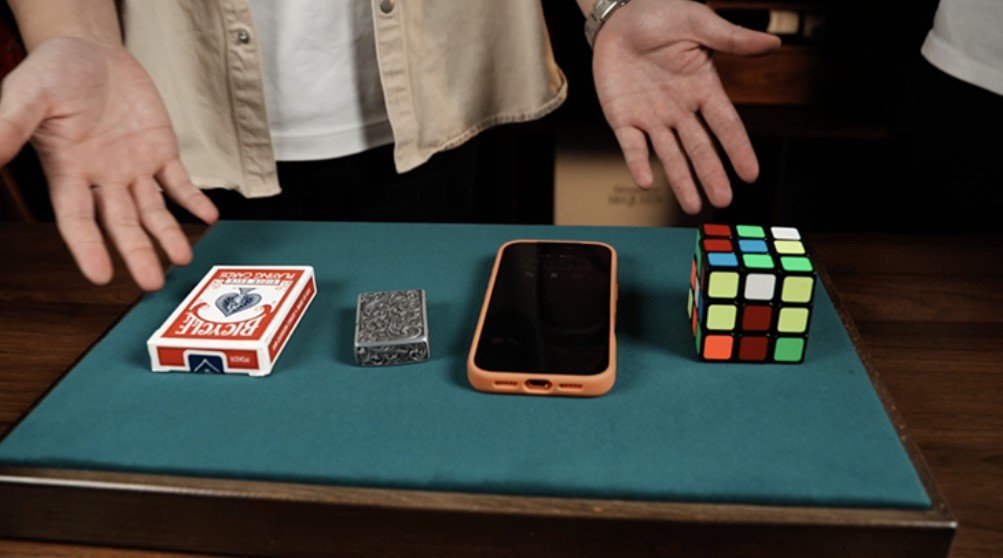 The magician borrows four random everyday items from the audience – a wallet, phone, air pod, or any small object the spectator is carrying. All items are placed openly on the close-up pad.
