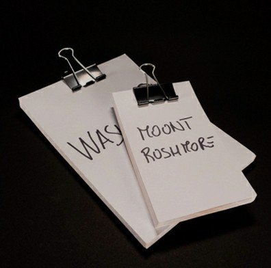 Cards are dealt to the spectators to shuffle. They clearly see that each one bears the name of a celebrity, a country, a landmark, a corporate brand—in fact, you can customize them to suit any routine. The cards are gathered "into blocks" and held together with a bulldog clip. A spectator lifts the cards from a random spot between the pages of the book and… your work is done!
