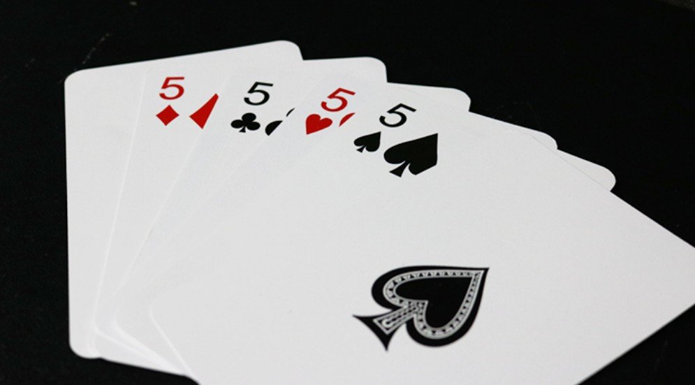 Four mini jumbo blank paying cards are shown. With a simple twist they will turn into four aces and finally into four Fives'.