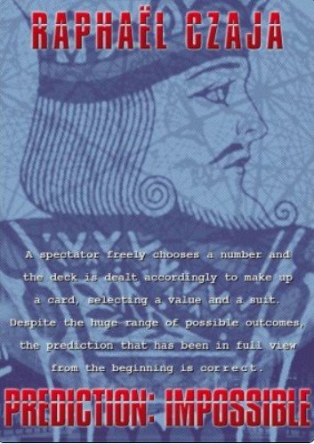 A spectator selects any two-digit number up to 50. The deck is dealt accordingly to make up a card, selecting a value and a suit. Despite the huge range of possible outcomes, the prediction that has been in full view from the beginning is correct.