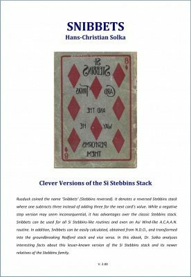 The name 'Snibbets' (Stebbins reversed) was coined by Rusduck. It denotes a reversed Si Stebbins stack where instead of adding 3 to get to the next card's value one substracts 3. The first to publish a negative step version was Ernest Hammond in The Magic of Tomorrow. While this may seem a rather inconsequential change, it has some advantages over the classic Si Stebbins stack. In this ebook, Dr. Solka takes you through the details of this lesser-known version of Si Stebbins.