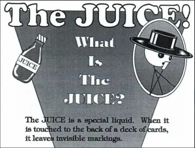 The JUICE! is a special liquid. When it is touched to the back of a deck of playing cards, it leaves invisible markings. WHAT GOOD ARE INVISIBLE MARKS? Though an audience can not see these markings – even under bright lighting and close inspection – they will stand out to you as if they were neon signs! No special glasses or other device is needed. You will be able to easily identify any card from its back – even across the room! Includes enough JUICE! to treat several decks of cards! High quality instructions! (Not to be used for gambling.)