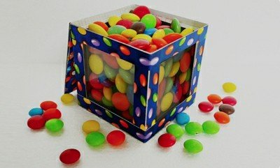 You open the transparent box and can, if you wish, hand out or shake out the candies, the box is now also printed with a candy print!