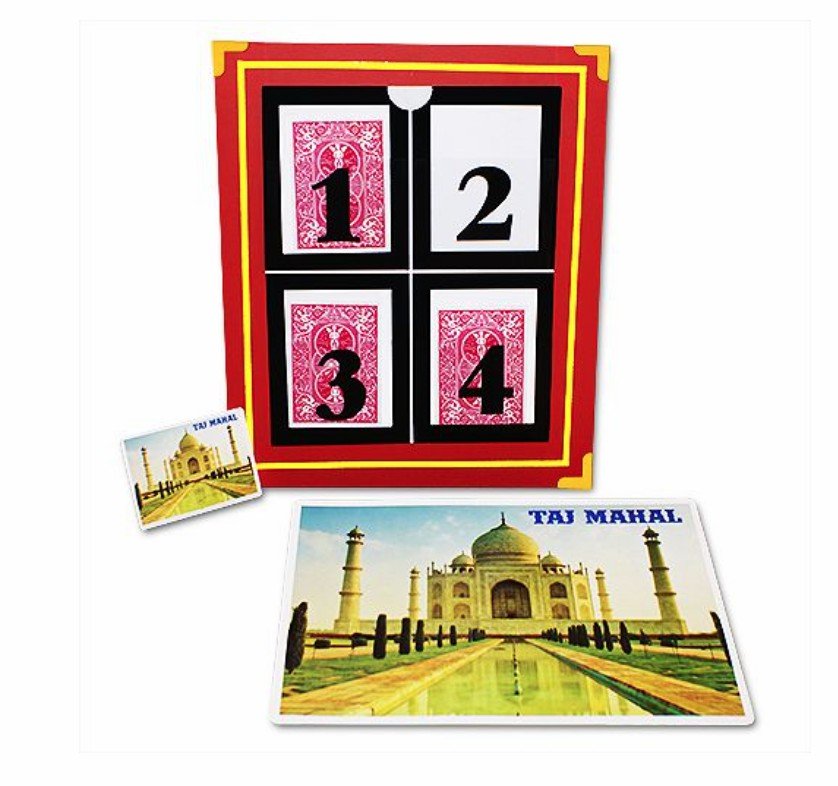 Next the spectator freely chooses any one of the cards and turns it over to show its face. Believe it or not, on the back of the board there will be a giant card for the magician’s prediction that will have on it exactly the tourist attraction chosen by the spectator!